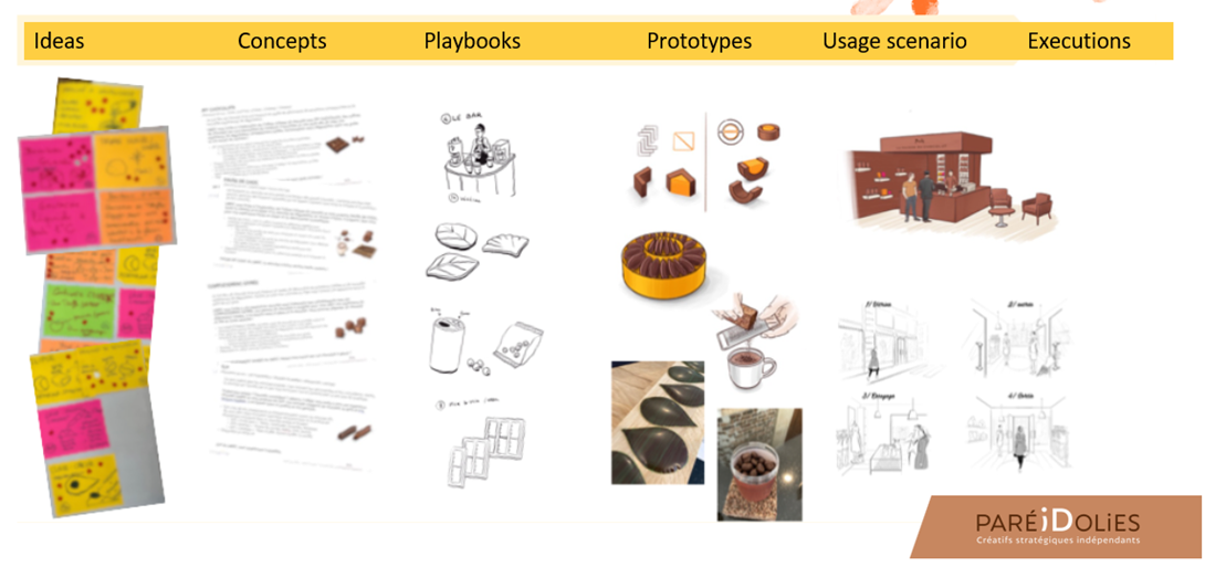 This stage generates hundreds of ideas, which are then shaped into concepts, playbooks, prototypes, usage scenarios.