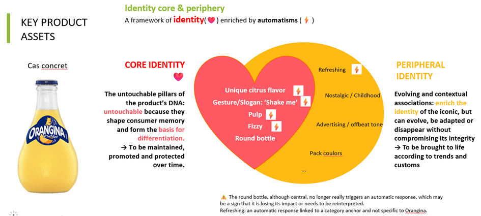 Example: Orangina reveals its identity pillars: Citrus taste, pulp, fizziness, the gesture/tagline “Shake me”… all form an intangible foundation.Meanwhile, attributes like pack colours, advertising tone or nostalgic territory belong to the evolving periphery.