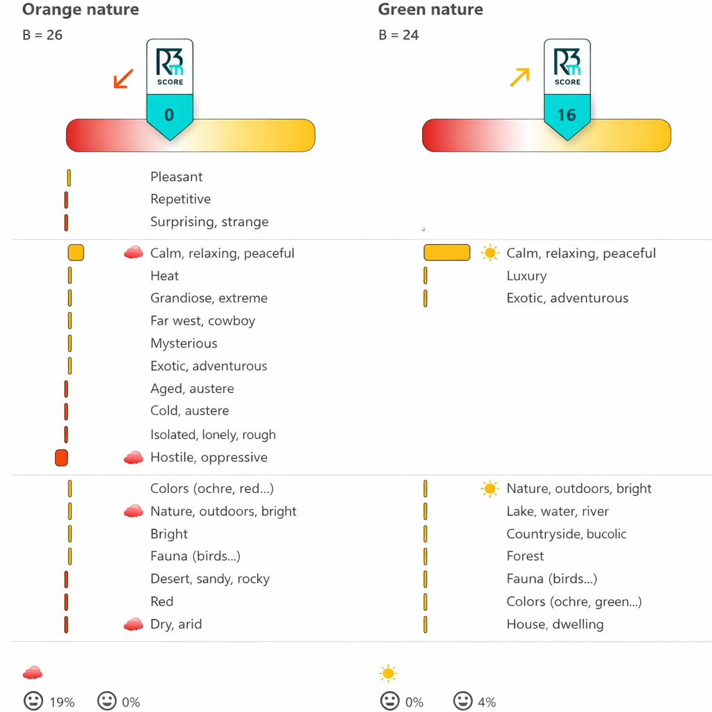 Among the underlying psychological mechanisms we chose to study, the loss of time perception (a component of the flow state) proved to be a decisive marker of creative performance. Both natural environments also passed the R3M Score test, a tool developed exclusively by Repères to assess emotional arousal in response to a stimulus. The results showed that the green/blue‑dominated natural environment is perceived more positively than the red/orange‑dominated environment. This difference in emotional activation could explain the results obtained on the originality score in the first part of the creative activity, which favored the green/blue‑dominated environment.
